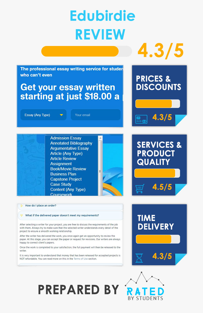 We don't believe that the copywriters at Edubirdie are native, and their resources aren't excellent. Our ranking for this firm is "poor". It may be a scam or a fraud.